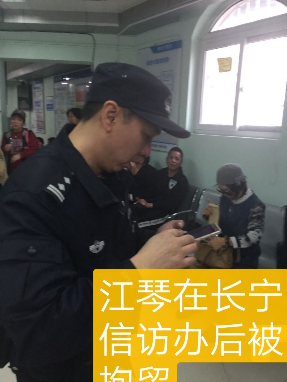 2018年上海进博会前夕,美籍华人访民江琴被“维稳”在长宁信访办。(受访者供图)