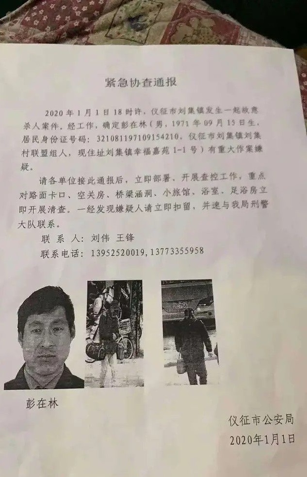 通过对重点路线场所的搜捕,1月2日上午9时许,仪征市公安局发现嫌疑人彭在林在刘集镇刘集村自杀死亡。