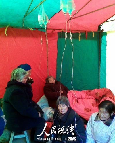 1月30日上午,在紧邻江苏滨海县城的东坎镇三友村一角看到,一条水泥路上搭建起彩布帐篷,里面住着十几个80岁左右的老太太,这些老人或无奈地瘫在草地上,或神情憔悴地躺在棚内被褥里,每人都十分虚弱,而且还吊着药水。据村民讲,这十几个老奶奶们住在这里已两天两夜了,白天高峰期有20余人。