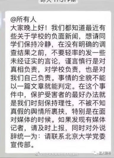 另外,网上传出北京大学党委宣传部发给北大学生短信,要学生“保持泠静”,不要“轻率”发表言论。如发现媒体记者,要及时上报。