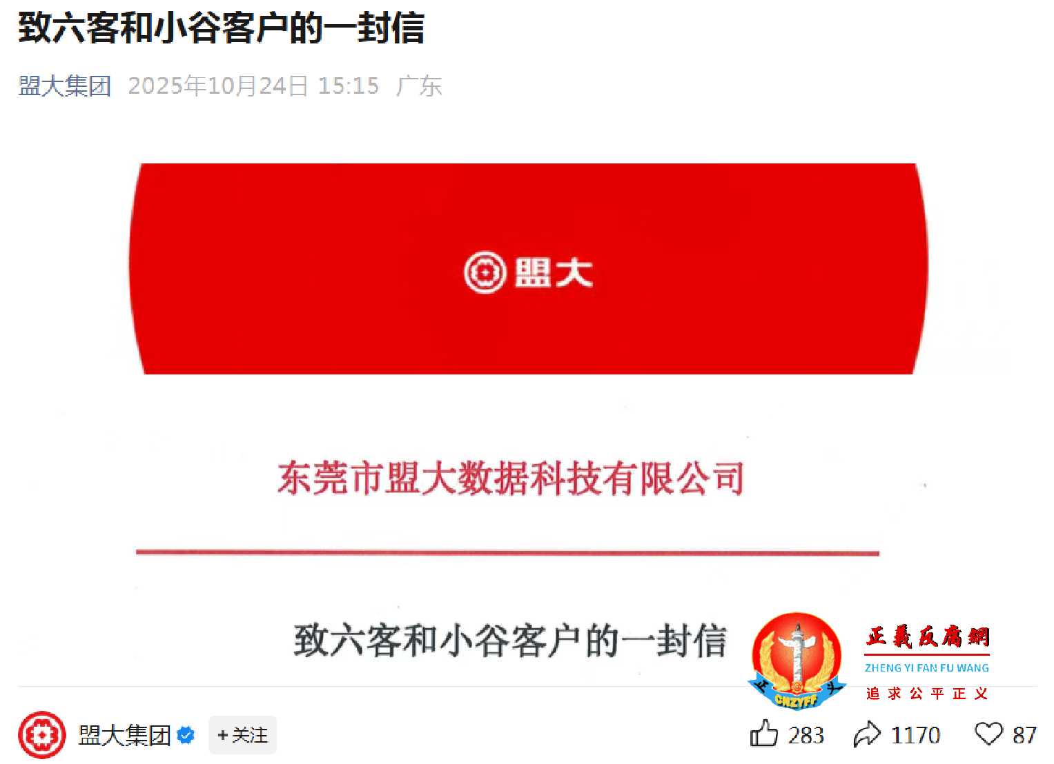 ▲10月24日,盟大集团官方微信公众号发布了一封《致六客和小谷客户的一封信》。(图片来源:公众号“盟大集团”)