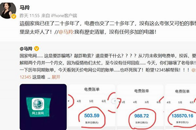 10月23日晚马羚发微博称,“国家电网太可怕了!我一家两口人,如何一个月用十余万元的电费?”