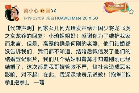 1月19日22时左右,一名中共红二代在个人微博发布何长工家族的代转声明,声明中证实高露的确是何长工的孙媳妇。