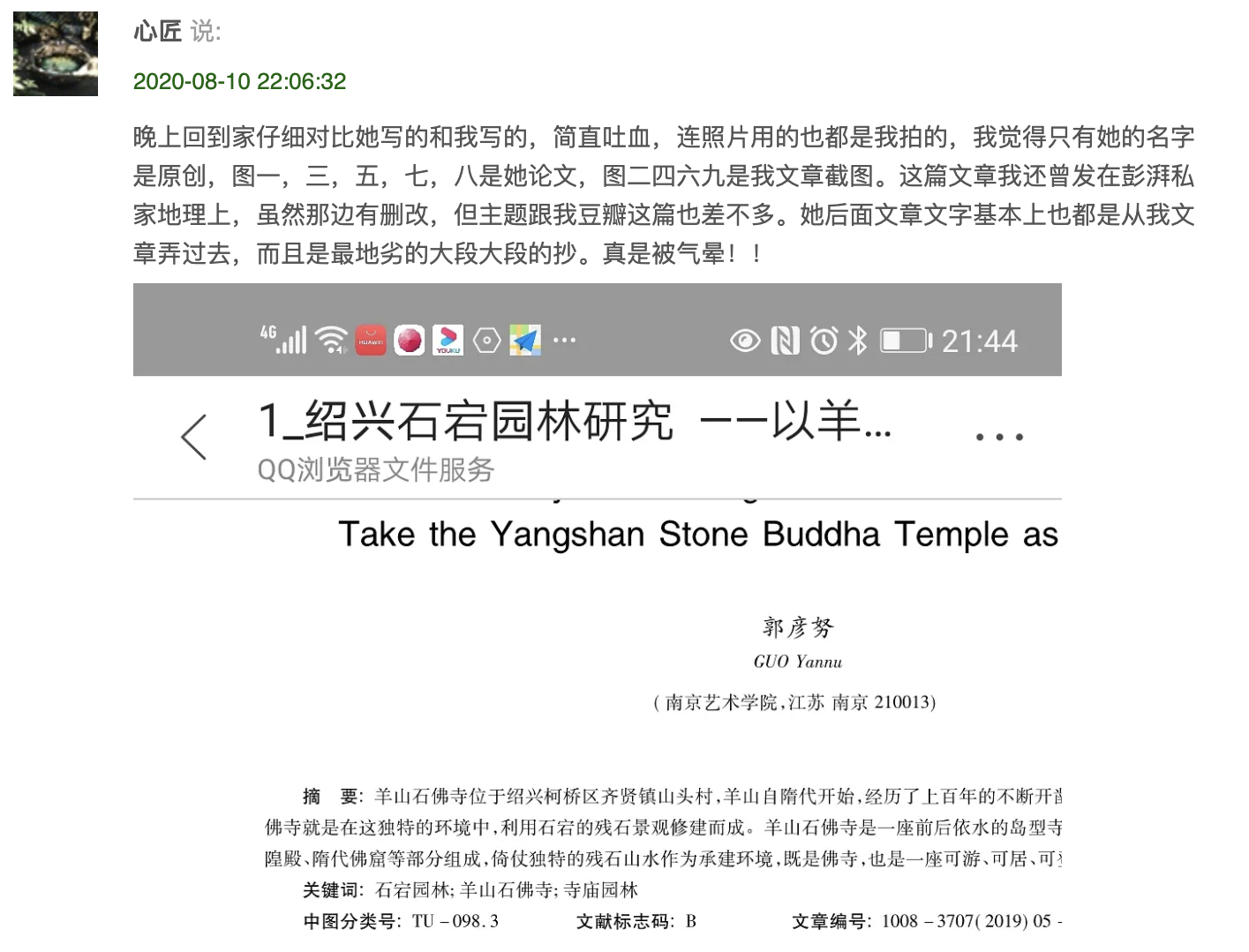 2020年8月10日,心匠再次发现郭彦努的另一篇期刊文章《绍兴石宕园林研究——以羊山石佛寺为例》大量抄袭他的旧文《深山藏古寺(八)——古宕石佛寺》。