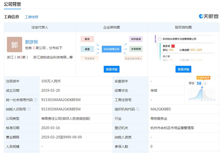 ▲杭州拾众创想文化发展有限公司法定代表人郭彦努(来源:天眼查查截图)