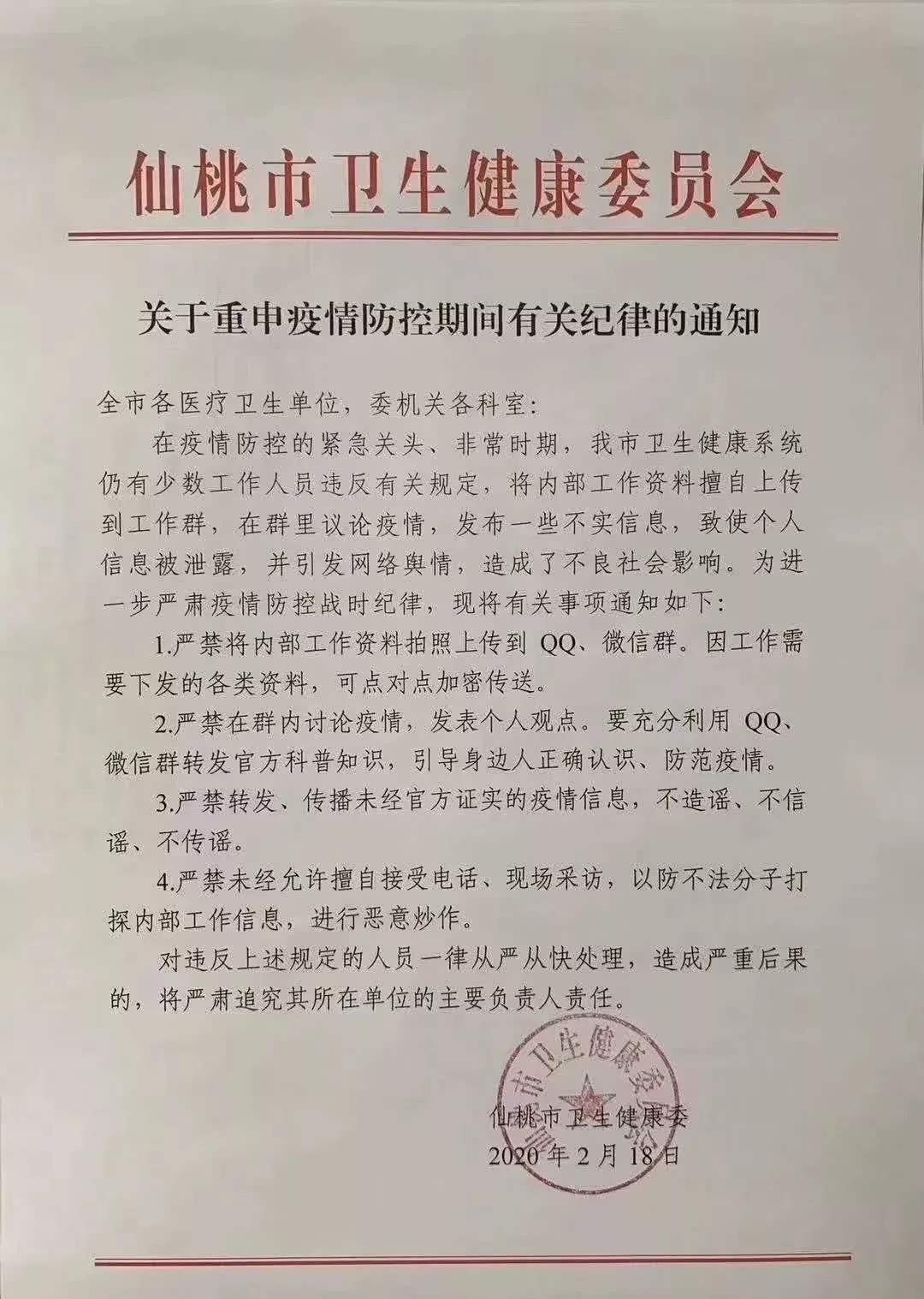 湖北仙桃卫生健康委下发通知封锁疫情 曝光后官方称作废