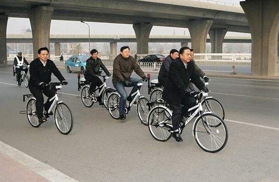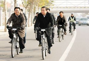 图为“作秀”天津市公安局长武长顺(左一)带领各主管部门同志骑车巡查。