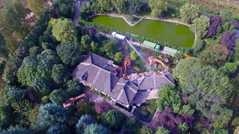 图为2018年9月29日,西安市石井镇蔡家坡村的超大违建别墅被挖掘机拆解。(图片来源于网络)