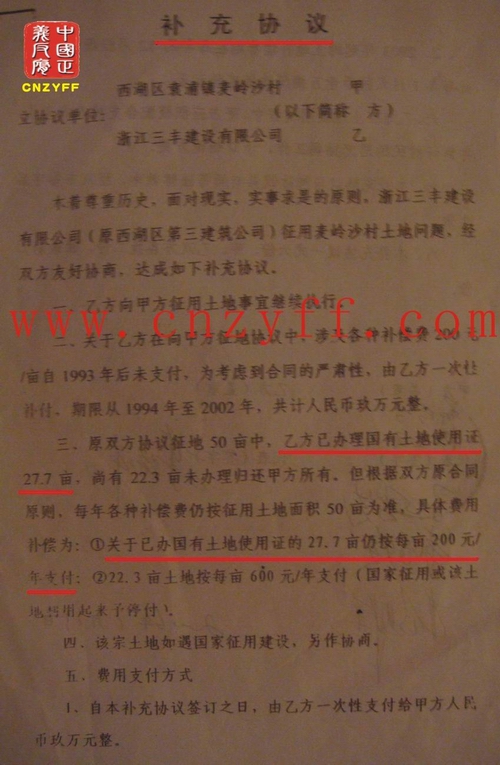 中国正义反腐网【浙江站讯 记者:程 敏 求公正】2006年3月当杭州通利混泥土有限公司总经理毛国兴带人开着推土机。进入杭州市西湖区袁浦镇麦岭沙村部份村民承包耕作的良田上运作时,这些村民连作梦都没有想到,明明与袁浦镇政府和村委会签订过30年土地经营承包合同,手中还捏着由浙江省人民政府颁发的《农村集体土地承包权证》刚刚才经营了5年时间的村级集体土地。怎么一下子变成了国有土地而出让给杭州西湖区三丰建筑工程有限公司了呢?更令众多村民疑惑得是实际用地人却是杭州通利混泥土有限公司?经过一个星期的全面深入调查,记者为您揭开官商勾结,骗卖集体耕地牟利的种种惊人黑幕。