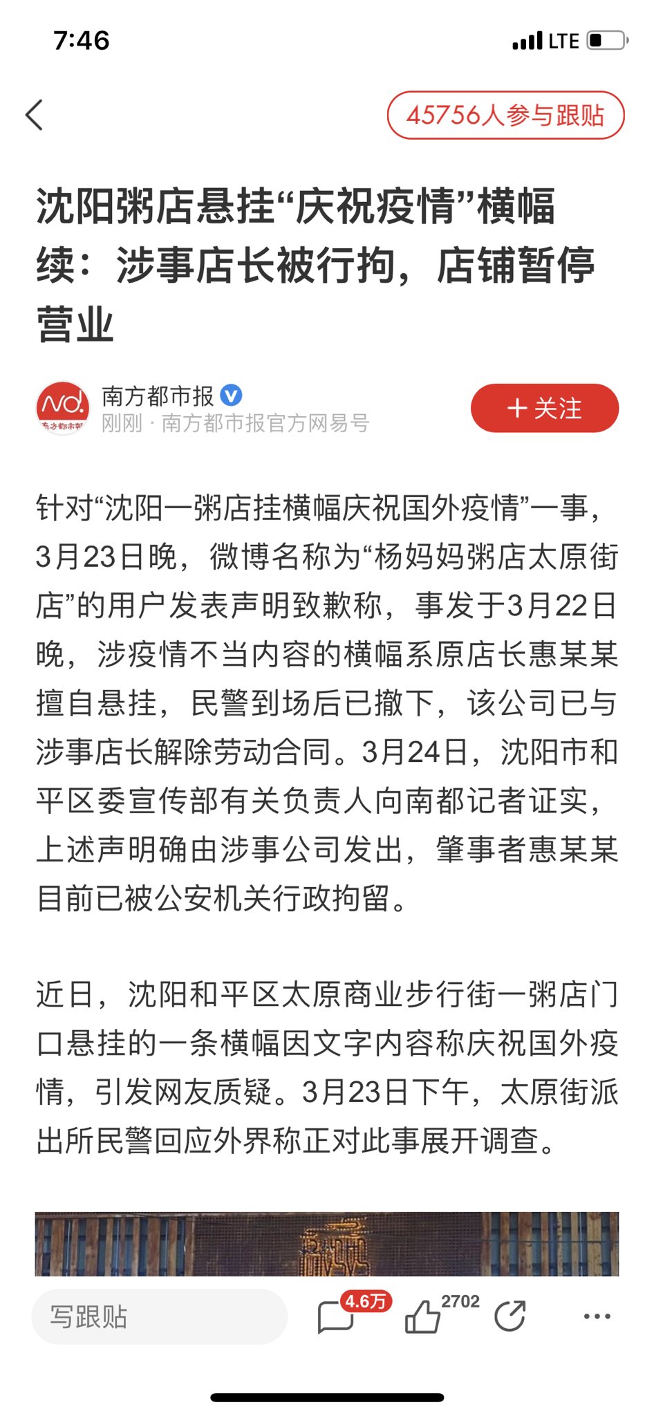 24日,据媒体报道,事发于沈阳和平区的杨妈妈粥店太原街店,当地政府表示横幅已于23日撤下,多个部门“介入调查”,店长也被警方带走。