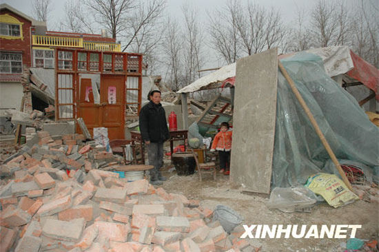拆迁户韩光勇站在棚子门口,棚子旁是被强拆的房屋。记者 程士华 摄