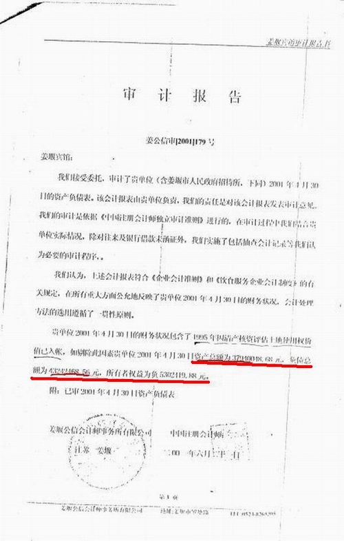 原政府招待所于2000年12月4日进行了整体资产评估,截止2000年9月30日创造的总资产为6928.96万元。负债4267.62万元,净资产为2661.33万元(见附件)。而法院民事裁定书上(见附件)截止2001年4月30资产总计2787.14万元,负债4340.59万元。从评估和法院裁定的时间间隔来年,短短七个月的时间,我们的总资产就流失4141.62万元?这显然不是事实,其中必有猫腻,用非法的评估,让“资不抵债”成为事实,难道这就是阳光政府的“阴谋”?