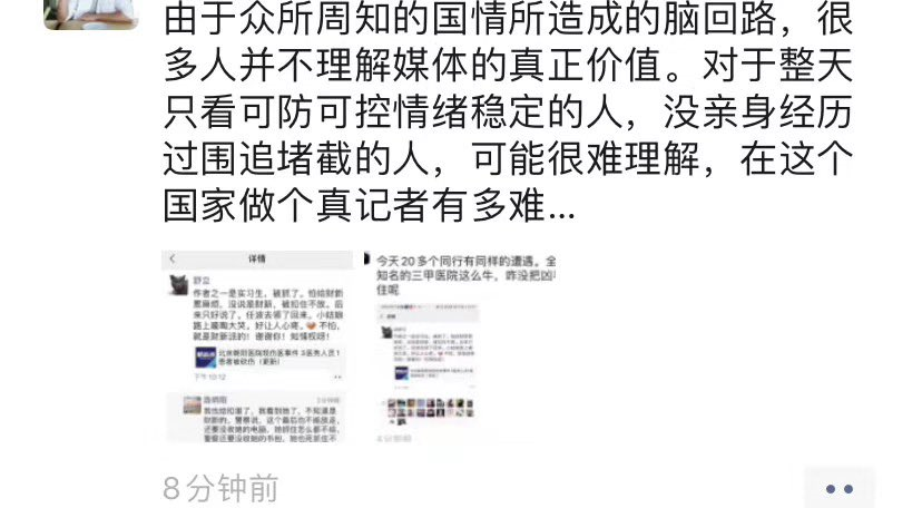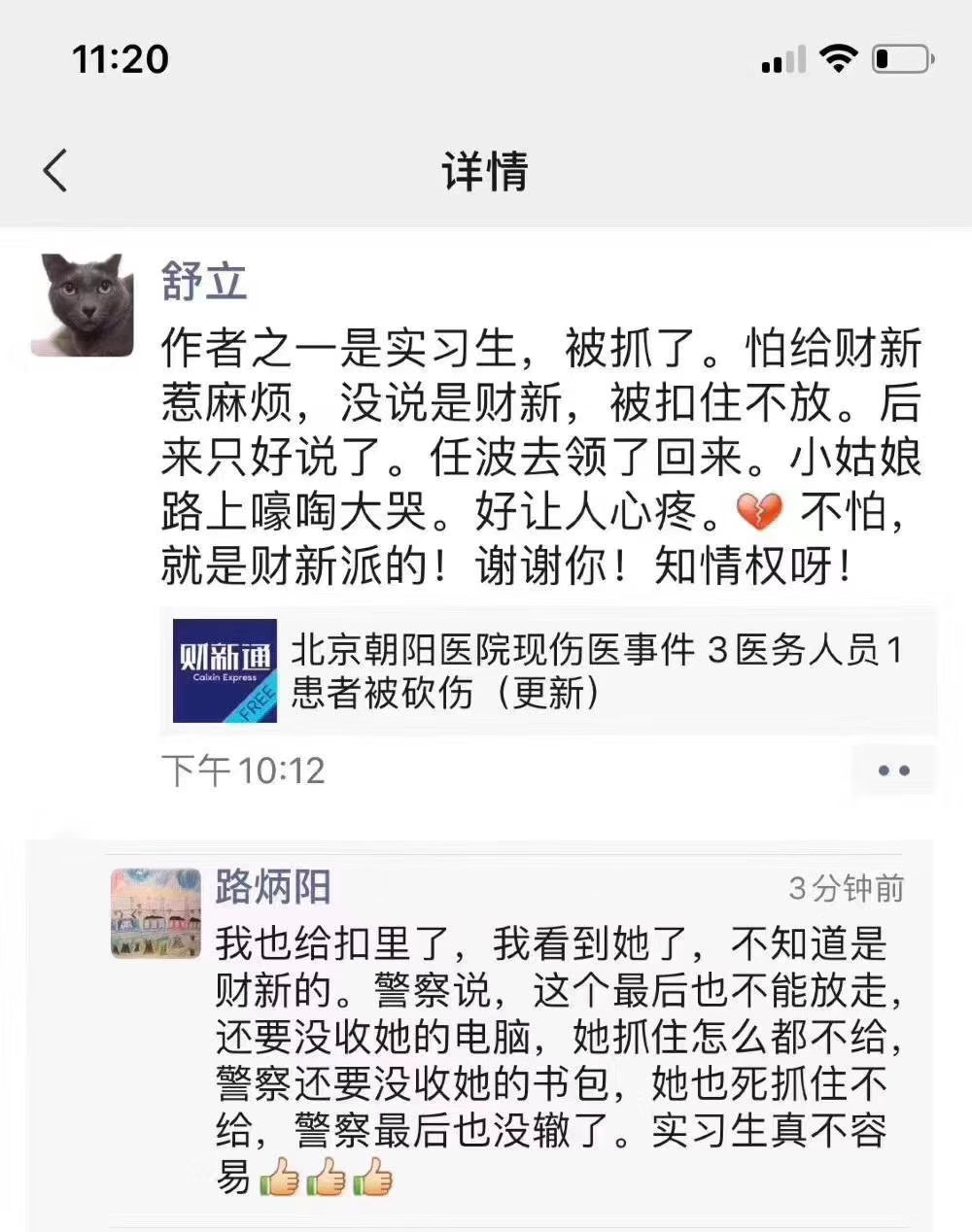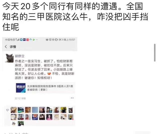 微信圈消息称,共有20来个同行有同样的遭遇,并质问:“全国知名的三甲医院这么牛,怎么没把凶手挡住呢?”