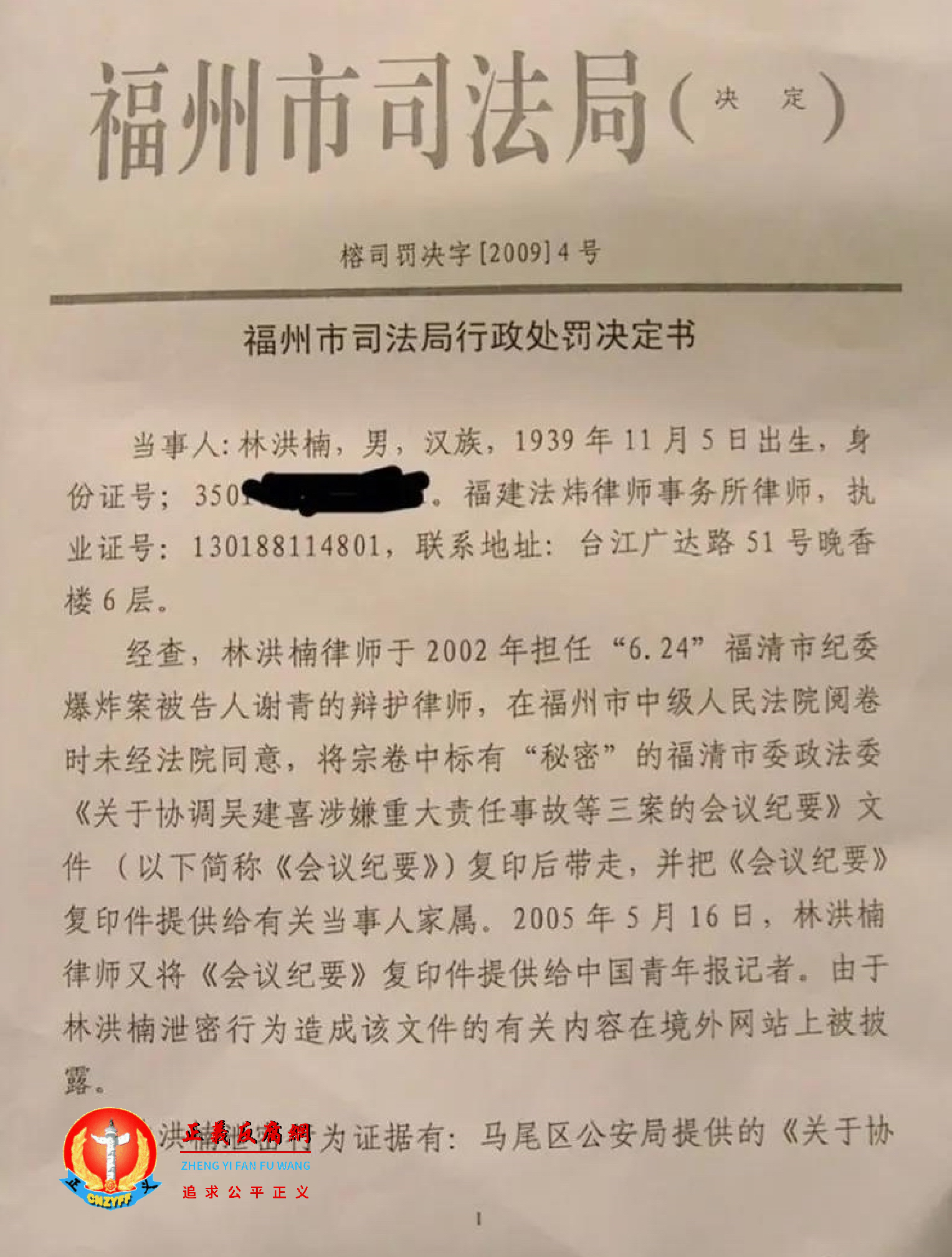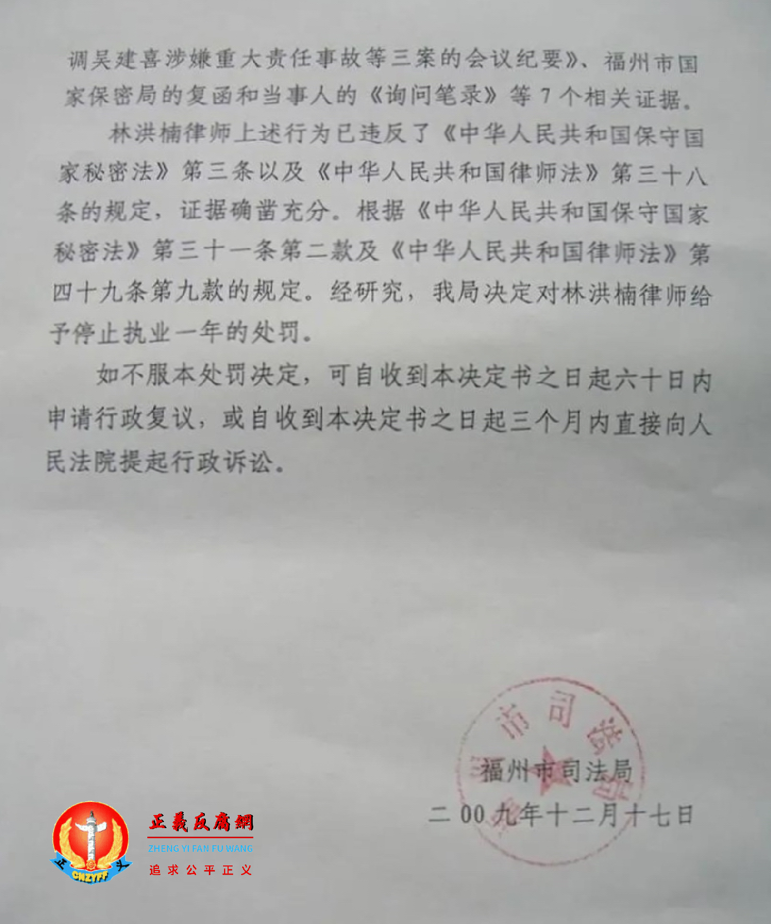 2009年12月23日,福州市司法局给他送达了一份行政处罚决定书。